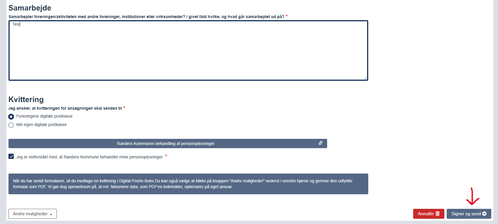 1) Udfyld blanketten og klik derefter på knappen "Signer og send" i nederste højre hjørne.